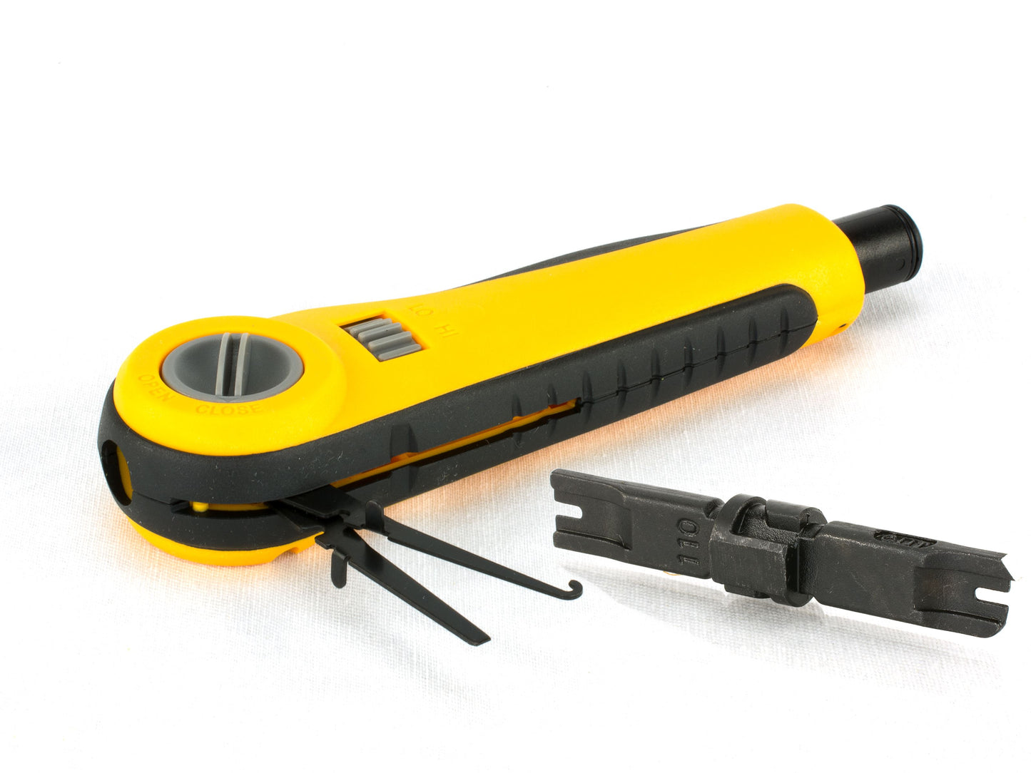 A 110 punch down tool is a small hand tool used by telecommunication and network technicians. It is used for inserting wire into insulation-displacement connectors (IDC) on punch down blocks, patch panels, keystone modules, and surface mount boxes (also known as biscuit jacks).